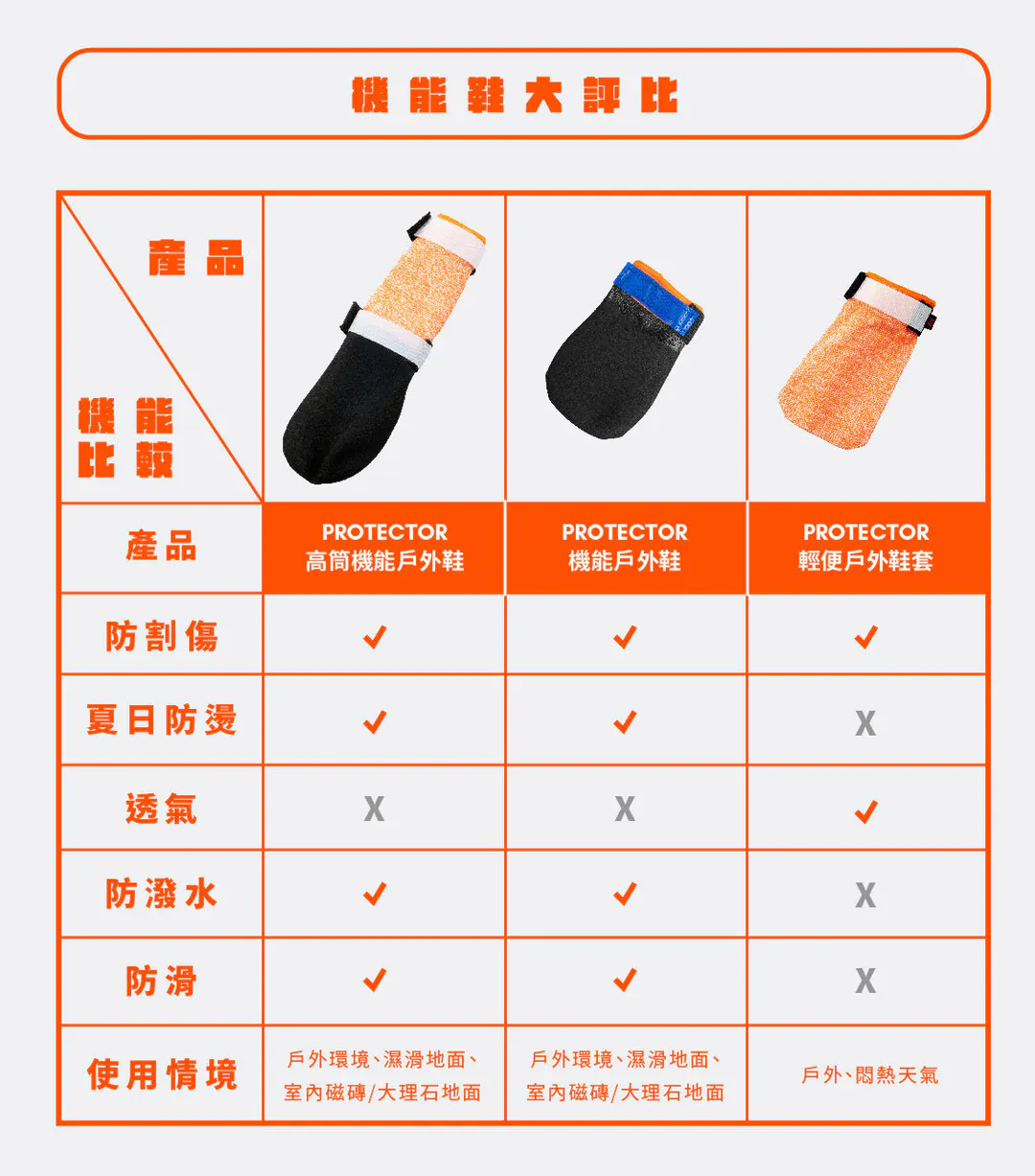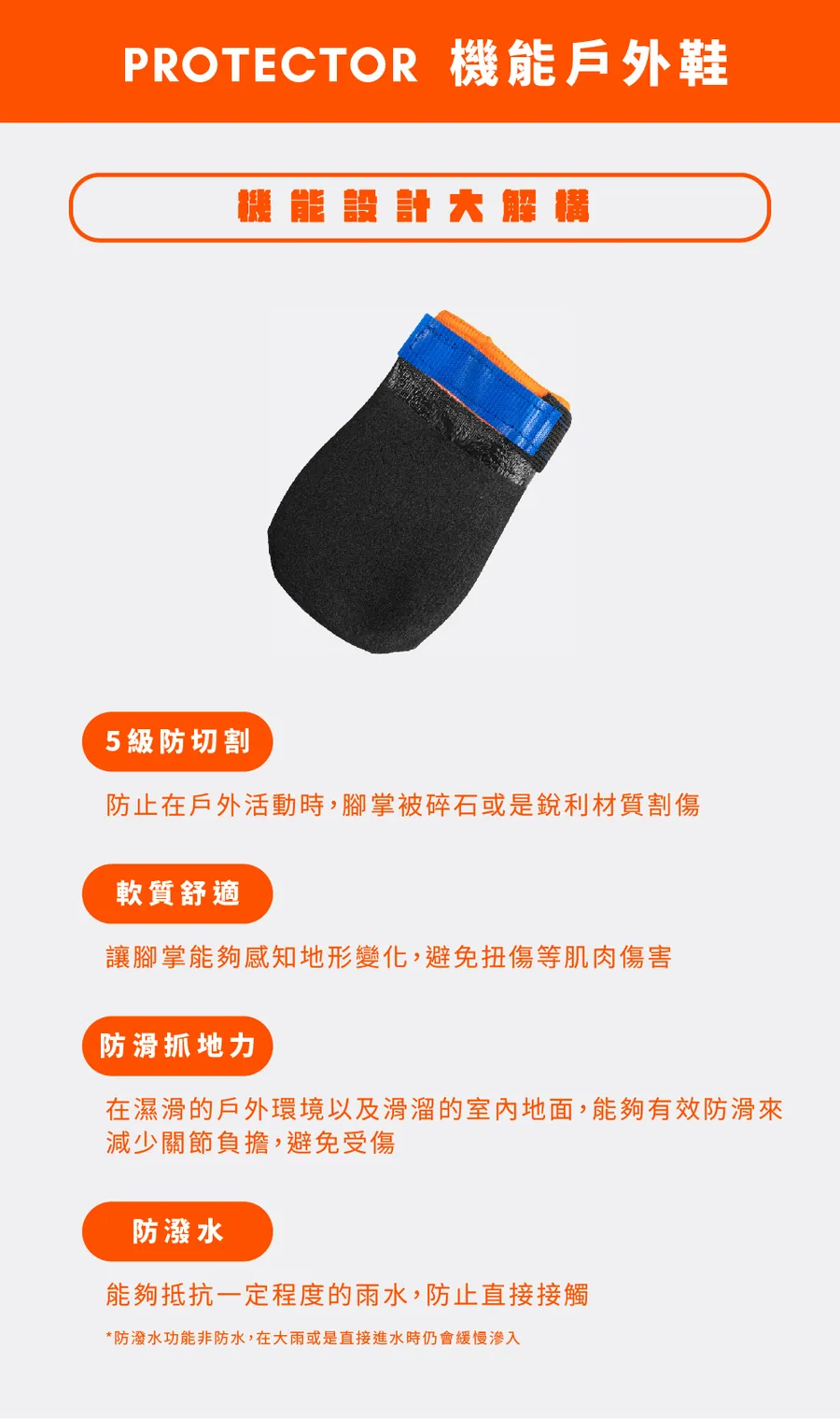 PROTECTOR機能戶外鞋是為了戶外運動所設計,在任何需要保護狗狗腳掌的場合都能夠適用。鞋子內層沒有任何車線來減少摩擦傷害到狗狗的腳掌,軟質的鞋子設計能夠讓毛孩在受保護的情況下依舊能清楚透過腳掌感覺地形的變化。鞋子是使用了魔鬼氈來做固定,並且不會輕易掉落。PROTECTOR防刮鞋一組四隻出售。